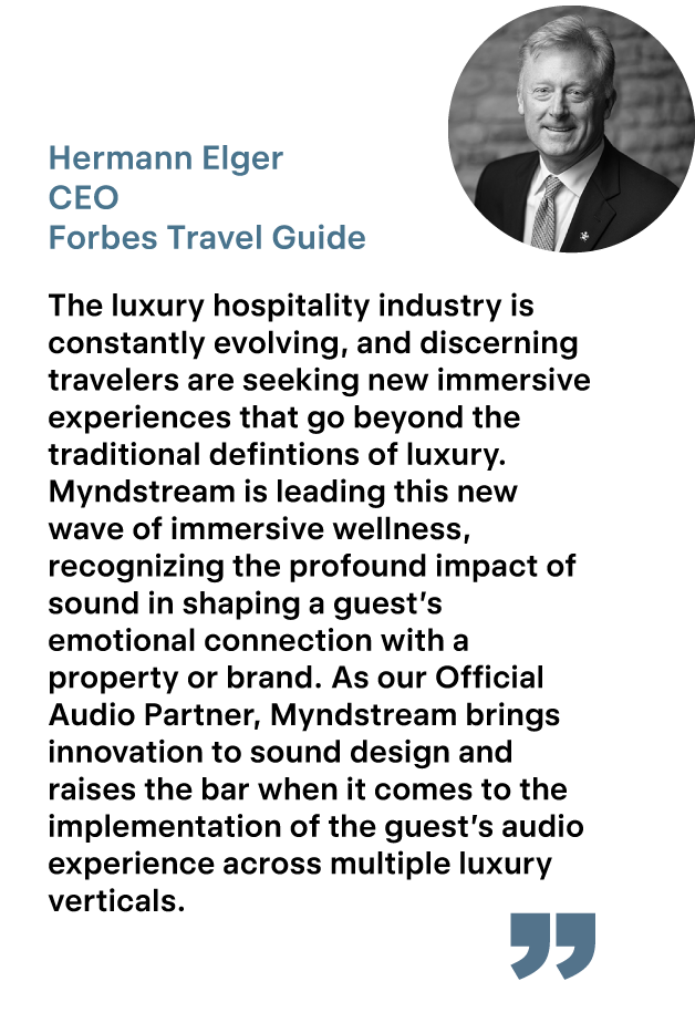 Recognized as the gold standard in audio in the hospitality and wellness industries, Myndstream is proud to be the official audio partner to Forbes Travel Guide and the Global Wellness Summit.
